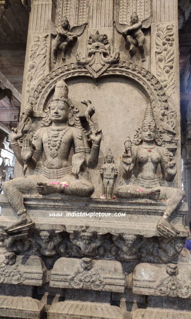 - மூன்றாம் பிரகாரத்தில் பிரம்மா,விஷ்ணு ,சிவன் மூவரும் ஒருங்கிணைந்த ஏக பாத மூர்த்தி சிற்பத்தை தரிசிக்கலாம் .குறத்தி மண்டபத்தில் நடன மங்கையர் மற்றும் குறி சொல்லும் குறத்தி போன்ற சிற்பங்கள் மிக அழகாக செதுக்கப்பட்டுள்ளன .அம்மன் சன்னதியின் பின்புறம் உள்ள ஆயிரம்கால் மண்டபத்தூணில் தொந்தியில்லாத ,புலி காலுடன் கூடிய வியாக்ர விநாயகரை தரிசிக்கிலாம் .இங்குள்ள ஊஞ்சல் மண்டபத்தில் உள்ள ரிஷபகுஞ்சர சிற்பம் விசேஷமானது .காளையை காணும்போது யானையும் ,யானையை காணும்போது காளையும் தெரியாது .மற்றும் வீணை இல்லாத சரஸ்வதி ,மேதா தட்சணாமூர்த்தி ,பஞ்சமுக விநாயகர் ஆகியவர்களும் இவ் தலத்தின் சிறப்புவாய்ந்தவர்கள் .